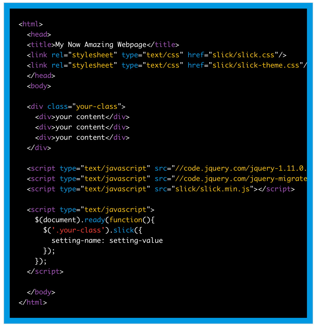 Note that Slick accepts as it's argument an Object (like when we're changing multiple CSS properties with jQuery).